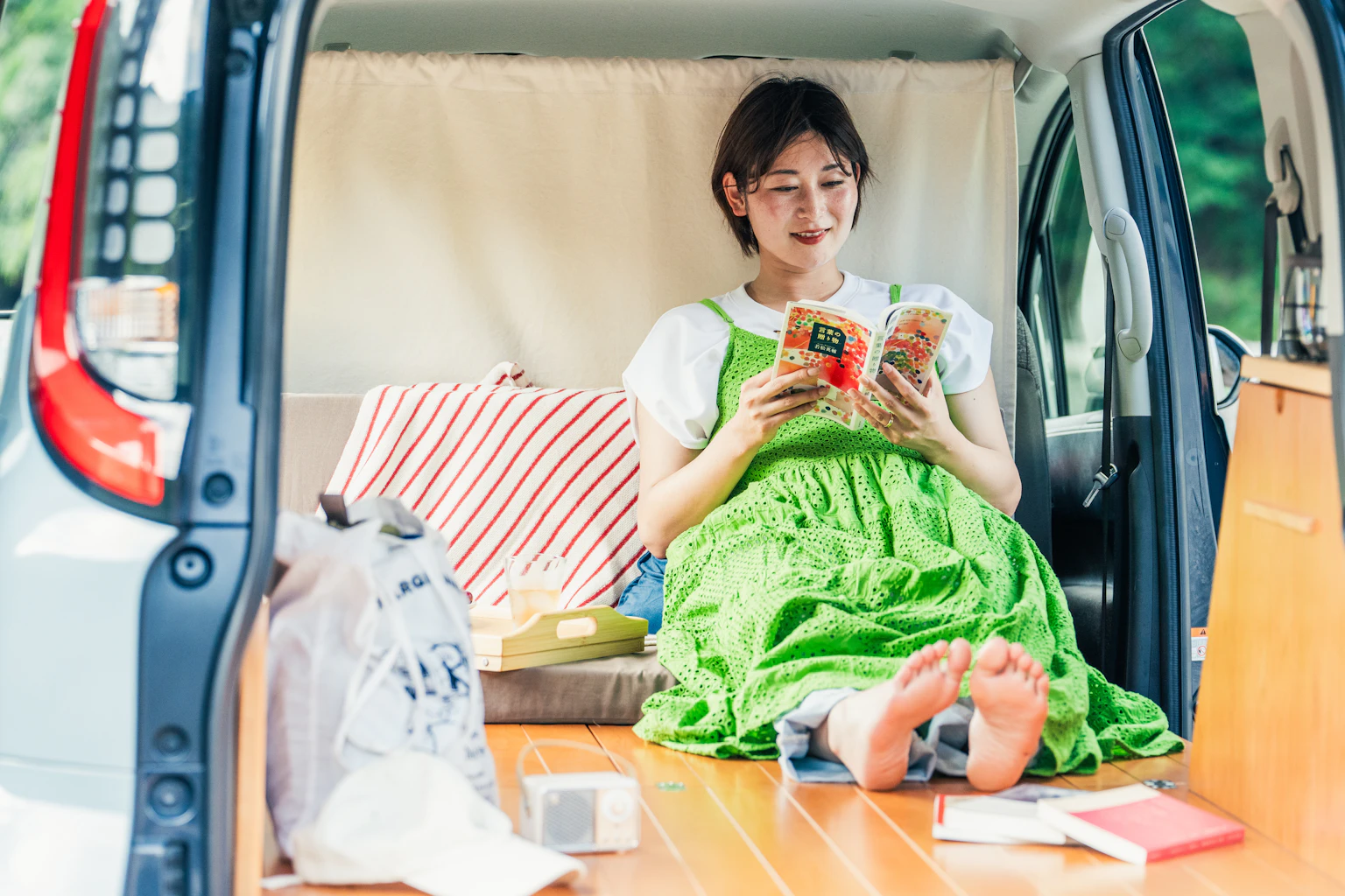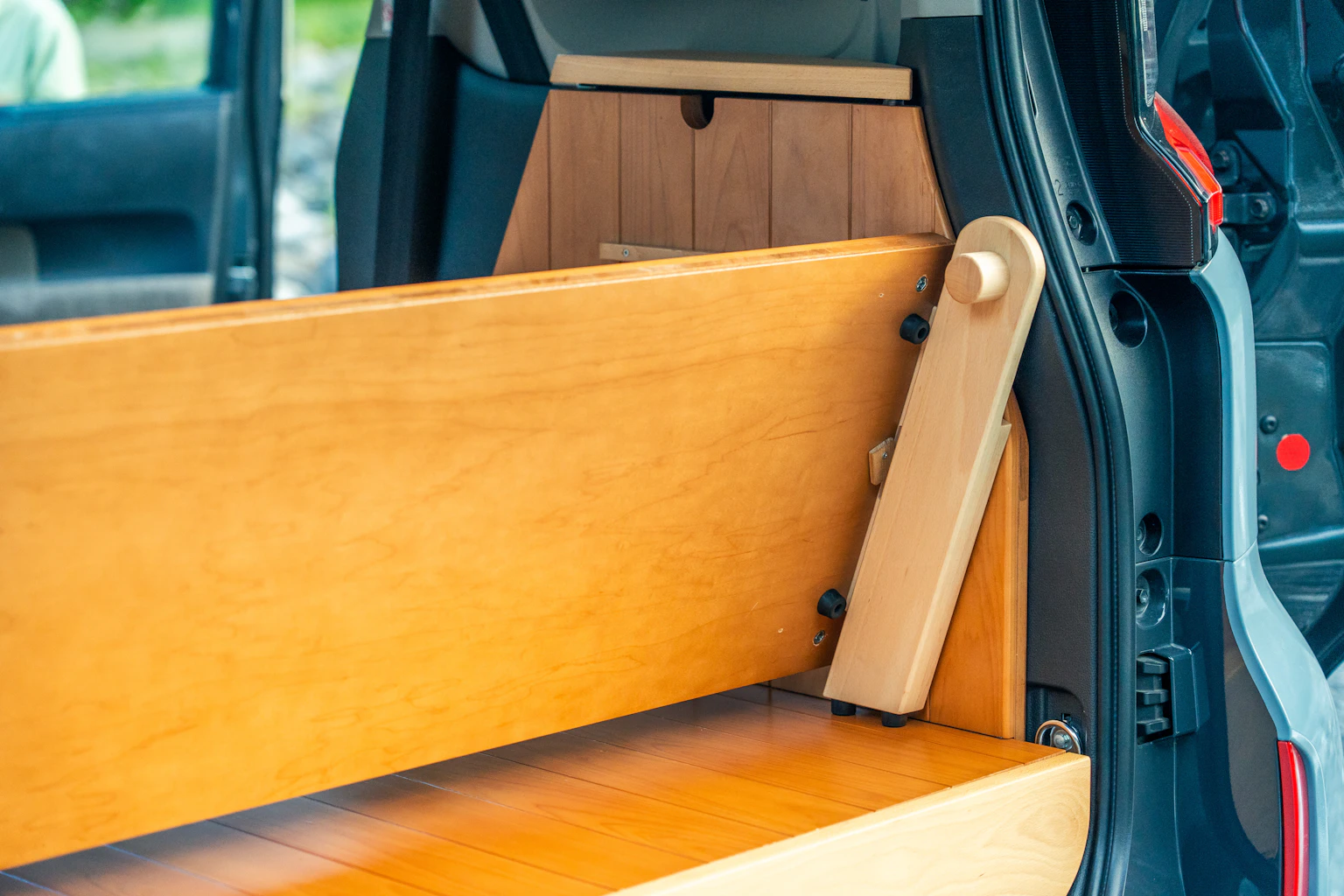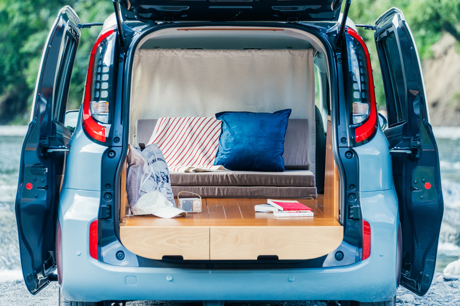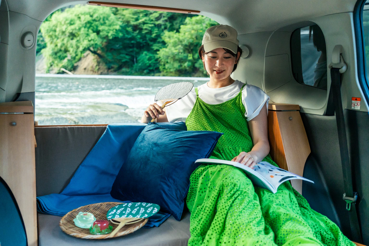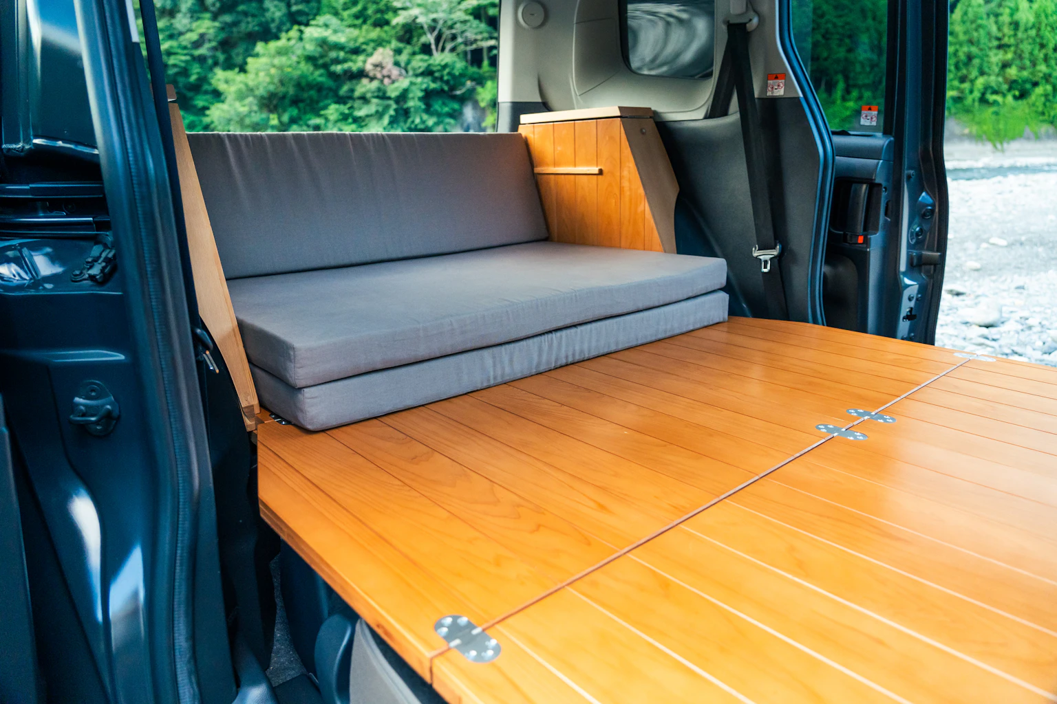 ソファモードは専用アダプターをセットすることで簡単にモードチェンジでき、偶然出会った絶景スポットや夜の車中泊シーンをゆっくりとくつろげるようになっています。また、専用アダプターを使わずにフロントシートにマットを立てかけることでソファの向きを後ろ向きにすることもでき、外の景色を味わいながら自分だけの時間を楽しむ空間にもなります。