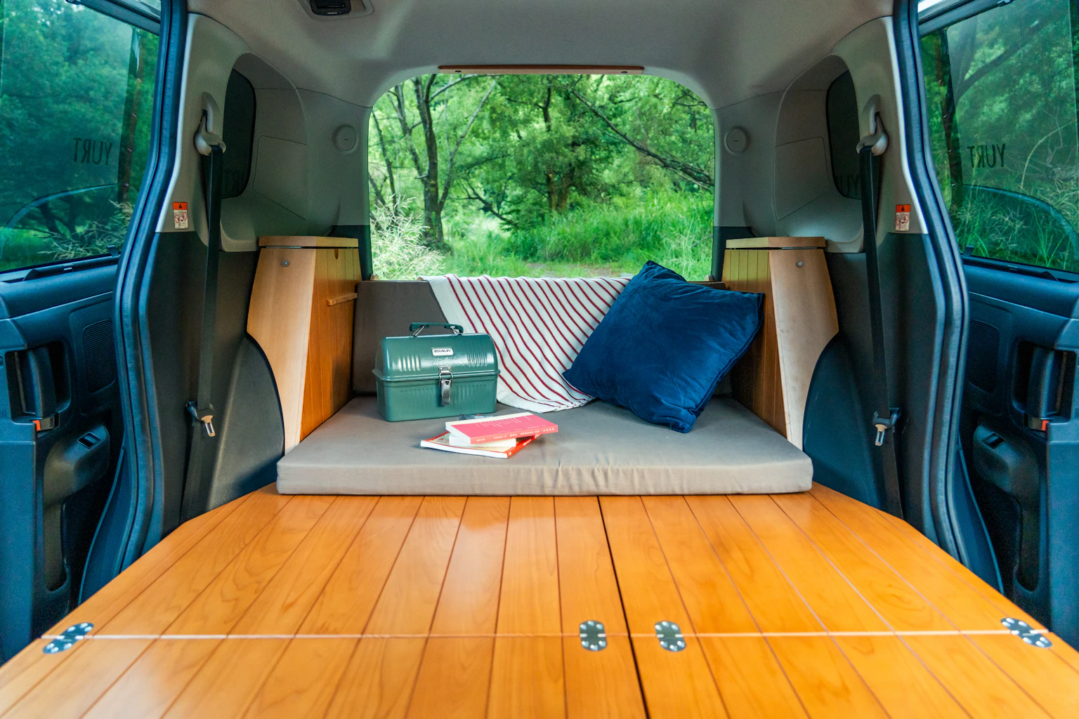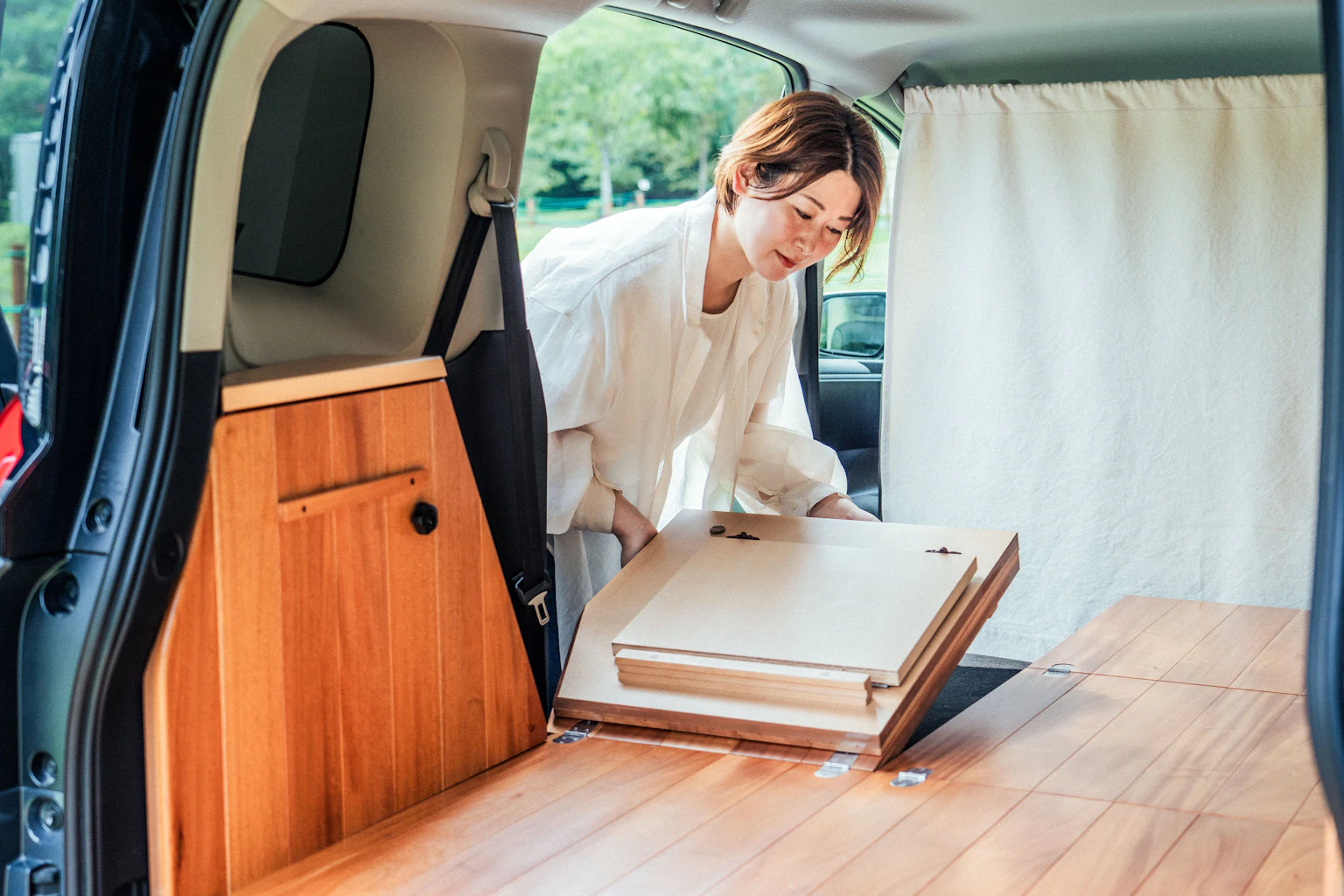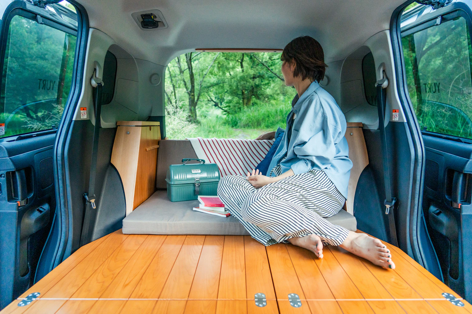 トヨタ シエンタが部屋になるルームキット。走行時は通常の5人乗り、くつろぐ時は大人2人がゆったりくつろげる部屋へとシームレスに切り替えができます。室内、室外で使えるテーブル付きです。